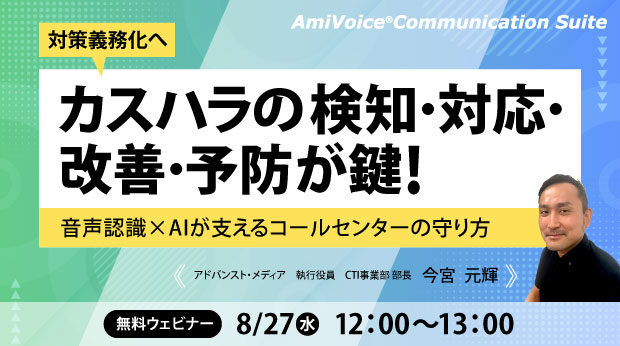 2025年8月27日(水)、株式会社アドバンスト・メディア(本社:東京都豊島区、代表取締役会長兼社長:鈴木清幸 以下、アドバンスト・メディア)は、「対策義務化へ カスハラの検知・対応・改善・予防が鍵!音声認識×AIが支えるコールセンターの守り方」を開催いたします。