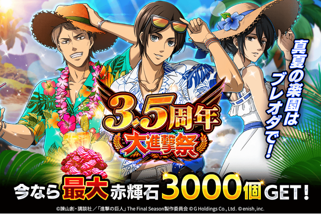 株式会社enish(本社:東京都港区、代表取締役社長:安徳 孝平、以下enish)は、アニメ『進撃の巨人』のスマートフォンゲーム最新作「進撃の巨人Brave Order」にて、2025年8月7日(木)より、ブレオダ3.5周年大進撃祭を開催!今ならガチャなどに使用できる赤輝石が最大3,000個もらえちゃう!またブレオダ3.5周年大進撃祭前半ミッションではエルヴィンの特別な衣装、陽炎が見せた楽園イベントでは育成素材の熟練技能書が最大300個がGET可能!その他、最新情報はゲーム公式サイト・ゲーム公式X(旧Twitter)アカウントにて随時公開して行きますので、ぜひご覧ください。