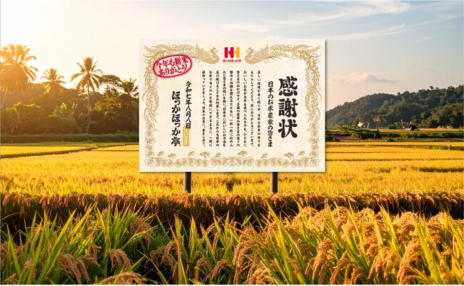 ほっかほっか亭が大切にしている炊きたてのおいしいお米を提供していただいている日本全国のお米農家の皆さまへ感謝を伝えるため、8月8日の“お米の日”に合わせて、田んぼに特大サイズの感謝状看板を掲出いたします。厳しい生産環境が続くなか、今年もおいしいお米の生産をしてくださることへの感謝の気持ちと、これからもお米農家の皆さまと共に、おいしいごはん、おいしいお弁当をお届けする決意を表明いたします。