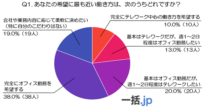 - 次いで多かったのは「基本はオフィス勤務だが、週1~2日程度はテレワークしたい」で20.0%(20人)、続いて「会社や業務内容に応じて柔軟に決めたい(特にこだわりはない)」が19.0%(19人)と、柔軟な働き方への一定の支持も見られました。