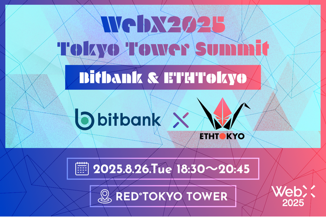 ビットバンク株式会社(本社:東京都品川区、代表取締役社長:廣末 紀之、以下、当社)は、Ethereumの開発と普及を推進することを目的とした東京発のグローバルなハッカソンおよびカンファレンス「ETHTokyo」(以下、ETHTokyo)と共同で、CoinPost が主催するアジア最大規模のWeb3 カンファレンス「WebX」に合わせ、2025 年 8 月 26 日に東京タワー「 RED° TOKYO TOWER」にて『WebX2025 Tokyo Tower Summit - Bitbank & ETHTokyo』を開催することをお知らせいたします。