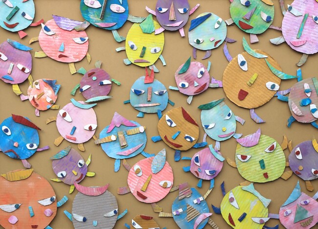絵画展にあわせた新作、いろんな表情の「きもちの妖精さん」たち ダンボール、アクリル絵の具