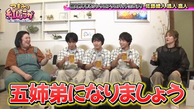 紅しょうがが、毎回、ステキな男子ゲストを招いて、“宅飲み”スタイルで食べて飲んで笑ってトークする『つまみは紅しょうが 男子~!宅飲みするからウチ来ぃや~』(毎月第3・4土曜23:30~)。8月16日(土)の放送回では、超人的なアクロバットとシンクロ率を見せる三つ子の佐藤綾人・颯人・嘉人の3名がゲストとして登場します。