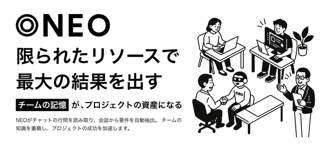 NEOは、チャットや会議などの複数人の会話をリアルタイムで整理・構造化し、必要な情報を即座に活用できる形に変換するクラウドサービスです。