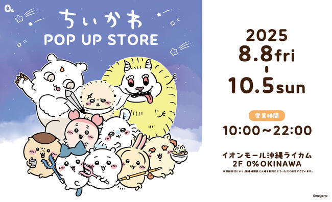 株式会社リウボウ商事(沖縄県那覇市、代表取締役:糸数剛一)は、株式会社Juice(東京都豊島区、代表取締役:神戸輝男)の協力のもと、2025年8月8日(金)、イオンモール沖縄ライカム(沖縄県中頭郡北中城村ライカム1番地)に、キャラクターやクリエイターのグッズを扱うセレクトショップ『0%(ゼロパーセント)OKINAWA』を開店いたします。第一弾として、8/8(金)~10/5(日)の期間『ちいかわ POP UP STORE』を開催いたします。