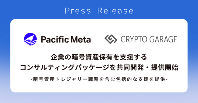 株式会社Crypto Garage(本社:東京都渋谷区、代表取締役:大熊将人、以下「Crypto Garage」)と株式会社Pacific Meta(本社:東京都港区、代表取締役:岩崎翔太、以下「当社」)は、このたび企業の暗号資産(仮想通貨)保有を支援するコンサルティングパッケージの共同開発、提供を開始いたします。