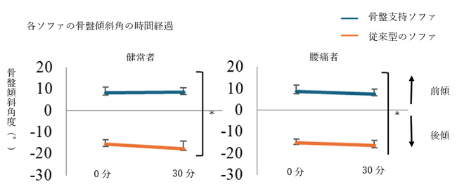 従来型のソファと比較して、骨盤支持ソファに座ることで、健常者および腰痛者ともに背中や腰の筋活動を要さずに30分間骨盤を前傾位に保持されていました。