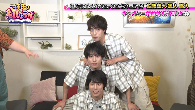 紅しょうがが、毎回、ステキな男子ゲストを招いて、“宅飲み”スタイルで食べて飲んで笑ってトークする『つまみは紅しょうが 男子~!宅飲みするからウチ来ぃや~』(毎月第3・4土曜23:30~)。8月23日(土)の放送回では、先週からの引き続きで、アクロバットがSNSで話題の三つ子の佐藤綾人・颯人・嘉人の3名がゲストとして登場します。