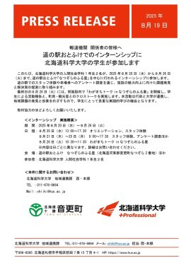 北海道科学大学(札幌市手稲区前田7条15丁目4-1)の人間社会学科1年生2名が、2025年8月20日(水)から8月26日(火)まで、道の駅おとふけ「なつぞらのふる里」(北海道河東郡音更町なつぞら2番地)を中心に行われるインターンシップに参加します。