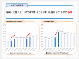 防災グッズ所有率について、熊本地震の発生地の近隣エリアである「福岡(北部九州)」と、北海道胆振東部地震の発生地の近隣エリアである「札幌」に着目すると、「福岡(北部九州)」では2016年熊本地震の翌年に所有率が3pt以上上昇、2021年長崎の豪雨の翌年も3pt以上上昇しています。「札幌」では2018年北海道胆振東部地震の翌年に10pt以上増加しています(図2)。北海道胆振東部地震発生時には、「札幌」を含む北海道全域で停電被害も起きていたこともあり、他の地区に比べて上昇率が高いことが伺えます。
