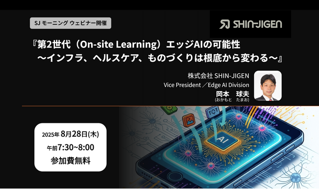 “ロボティクスとエッジAI”※1を武器にブレークスルーをサポートする株式会社SHIN-JIGEN(奈良県奈良市、代表取締役兼CEO:藤本弘道)は、故障などの異常の予兆検知手段として各方面で注目を集めている「On-site LearningエッジAI」に関する無料ウェビナーを2025年8月28日(木)に開催いたします。