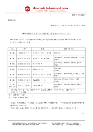 一般財団法人日本モーターサイクルスポーツ協会(MFJ)は、2026年の全日本ロードレース選手権の暫定カレンダーを発表いたします。2026年は全7戦、4月4日(土)~5日(日)に栃木県・モビリティリゾートもてぎにて開幕します。