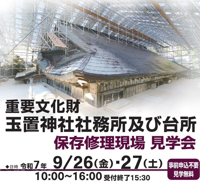 奈良県では、令和3年度より重要文化財 玉置神社社務所および台所の保存修理事業を進めています。今回、文化財建造物の修理の様子を広く知っていただくため、修理現場の一般公開を行います。普段は見ることのできない修理の現場を間近でご覧いただける貴重な機会です。ぜひご参加ください。