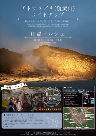 一般社団法人 摩周湖観光協会は阿寒摩周国立公園内の川湯温泉街でイベントを開催します。川湯マルシェでは地元飲食店が中心となり地元食材を活かしたグルメや雑貨の販売を行い、弟子屈町の無形文化財に指定された郷土芸能「川湯ばやし」や川湯温泉街をガイドと巡るツアーなどが楽しめる。アトサヌプリ(硫黄山)では、期間限定でライトアップを実施し昼間とは違う景観をご覧いただけます。
