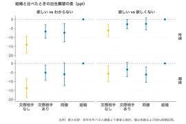●分析の結果、調査時に子どもがいない人のうち、交際相手がいない人は、交際相手がいる人、同棲している人、結婚している人に比べて、出生願望に対する回答が「欲しい」から「わからない」、「欲しくない」へと変化しやすく、特に「欲しい」から「わからない」への変化が顕著であることが明らかになりました。こうした変化は非交際期間の長さよりも、非交際になってからすぐに現れました。以上の結果は、交際相手がいないことが出生願望の実現を妨げている可能性を示唆しています。