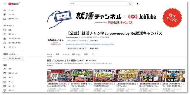 「就活チャンネルpowered by Re就活キャンパス」が、YouTubeチャンネル登録者数2万人を突破
