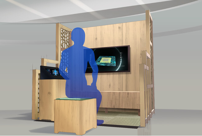 展示スペースでは、ウィドゥ・スタイルが製作する和空間をイメージした造作(ぞうさく)や日本古来の伝統畳の高級イ草の風合いと樹脂製の高い機能性を併せ持つ樹脂製畳「MIGUSA」を用いたスツール(一人用椅子)を設置します。スツールには、積水化学の介護向け離床・起き上がりセンサー「ANSIEL」(以下「アンシエル」)のセンシング技術を用いて、お座りいただいた方のバイタル情報を測定し、裸眼3Dモニターに表示させることで、未来の健康管理を疑似体験いただけます