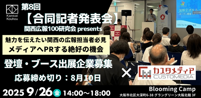 株式会社カスタメディア(本社:大阪市北区、代表取締役:宮崎耕史、以下 当社)は、2025年9月26日(金)に大阪・グラングリーン大阪北館3F「Blooming Camp by さくらインターネット」で開催される「第8回合同記者発表会」(主催:関西広報100研究会、共催:NPO法人生態会)において、ブース出展および登壇を行います。