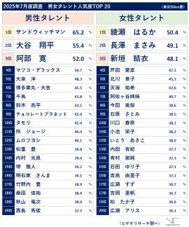 2025年7月度調査 男女タレント人気度TOP20(東京50km圏)は、本プレスリリースの末尾に掲載しています。
