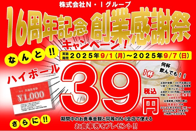 株式会社N・I(エヌアイ、本社:大阪府大阪市淀川区、代表取締役:河村 則夫)は、2025年9月で創業16周年を迎えます。これを記念して、運営する11店舗にて「16周年大感謝キャンペーン」を実施。2025年9月1日(月)~9月7日(日)の7日間限定で、ハイボールを1杯39円(税込)でご提供いたします。