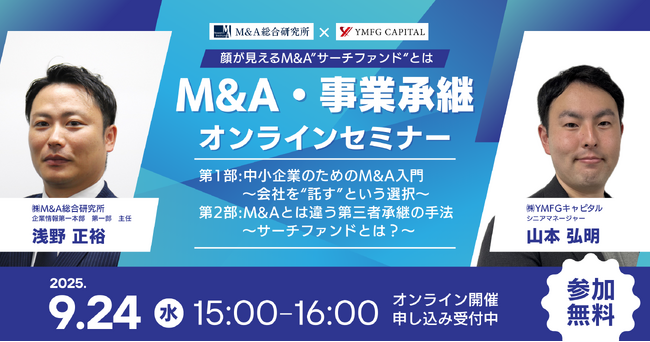この度、株式会社YMFGキャピタルと共同セミナーを開催することとなりました。同社は中四国エリアにおいて「スタートアップ投資」および「地域企業に対する出資と事業成長支援」の2軸で事業展開をしております。本セミナーでは、株式会社YMFGキャピタル シニアマネージャー 山本弘明氏をお招きし、「M&Aとは違う第三者承継の手法 ~サーチファンドとは?~」と題して、サーチファンドの仕組みやM&Aとの違いを解説していただきます。また、株式会社M&A総合研究所 企業情報第一本部第一部 主任 浅野正裕より、「中小企業のためのM&A入門 ~会社を“託す”という選択~」と題し、講演いたします。