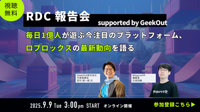 本報告会では、米国で開催される「Roblox Developer Conference(RDC 2025)」に現地参加するGeekOut株式会社 代表取締役 田中創一朗氏と、Mogura VR編集長の久保田 瞬が、発表内容や現地で読み取れた最新トレンドを共有します。