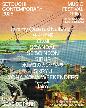 岡山県玉野市にて11月15日(土)に開催されるSetouchi Contemporary 2025 -MUSIC FESTIVAL-の最終ラインナップとして、SCANDAL、SKRYU、Ovall、中村佳穂、オープニングアクトとしてJairoも出演することが決定した。
