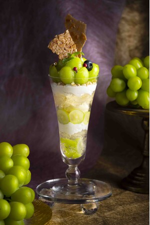 ぶどう専門農園「岡木農園」の最高級シャインマスカットを、贅沢に8粒使用しました。太陽の光をたっぷりと浴びて育ったシャインマスカットは、パリッとした弾けるような食感と、口いっぱいに広がる芳醇な香り、上品な甘みが特徴です。フランスロレーヌ産の塩を使ったミルクアイスや、スパークリングワインのジュレとの相性も抜群。自家製レモンカードとラズベリーソースの爽やかな酸味がアクセントに。さらに、香ばしいアーモンドチュイルや、サクサクとしたシリアル、グラハムクラッカーなどの食感も加わり、一口ごとに変化する味わいを最後までお楽しみいただけます。白とグリーンの上品なフォルムも美しい、珠玉の一品です。