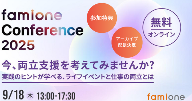 「子どもを願うすべての人によりそい 幸せな人生を歩める社会をつくる」をビジョンに掲げ、法人の従業員向け福利厚生や自治体の住民向け支援を行うヘルスケアサポートサービス「ファミワン」 https://famione.com/benefit/ などを展開する株式会社ファミワン(本社:東京都渋谷区、代表取締役:石川勇介)は、2025年9月18日(木)に「今、両立支援を考えてみませんか?- 実践のヒントが学べる、ライフイベントと仕事の両立とは-」と題した「ファミワンカンファレンス2025」を開催します。例年300名を超えるお申し込みをいただく本カンファレンスですが、多くのご要望にお応えし、アーカイブ動画の後日配信が決定しました。また、カンファレンス参加後のアンケートにご回答いただいた方には、特典として「妊活・不妊治療」「育休・時短勤務」「ヘルスケア」に関する動画データをご希望の方へ送付いたします。