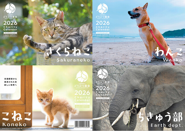 チャリティカレンダーは、「さくらねこ」「わんこ」「こねこ(卓上タイプ)」「ちきゅう部」の4種類。カレンダーを通して、温かい人たちに見守られて暮らすさくらねこ、命の危機から救われて幸せになったわんこやにゃんこ、そして世界中の美しい野生動物の姿をお届けします。