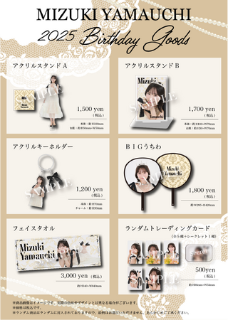 誕生日を記念したオフィシャルグッズには、撮り下ろしビジュアルの“アクリルスタンド”や、存在感抜群の“BIGうちわ”など、山内瑞葵こだわりのアイテムを多数ご用意しました。