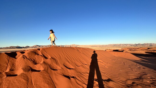 ナミビア・ナミブ砂漠を駆け抜ける娘。広大な大地と「まなざし」の象徴的な一枚