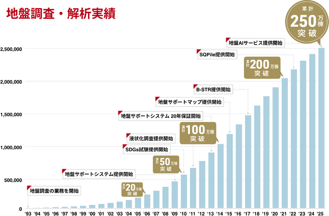 こうした技術と解析力の積み重ねにより、2025年8月末時点でジャパンホームシールドの地盤調査・解析実績は累計250万棟を突破しました。将来に渡って安全でより良いくらしを少しでも支えられるよう、私たちはこれからも地盤調査に真摯に取り組み、技術力の向上に努めてまいります。