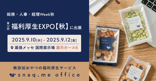 法人向け置き菓子・社食・オフィスコンビニサービス『snaq.me office(スナックミーオフィス)』を提供する株式会社スナックミー(本社:東京都中央区 / 代表取締役:服部慎太郎)は、2025年9月10日(水)~9月12日(金)に幕張メッセ 国際展示場(千葉県千葉市美浜区)で開催される「第12回 福利厚生EXPO【秋】」へ出展いたします。
