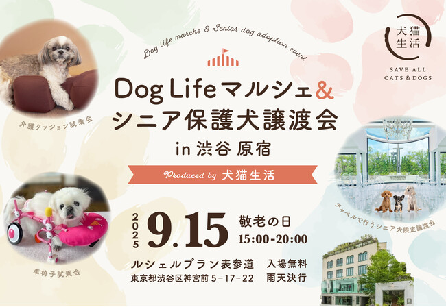 【タイトル】 「DogLifeマルシェ&シニア保護犬譲渡会 in渋谷原宿 ~Produced by 犬猫生活株式会社~」【開催日時】 2025年9月15日(月・祝) 15:00-20:00(譲渡会は19:00まで)