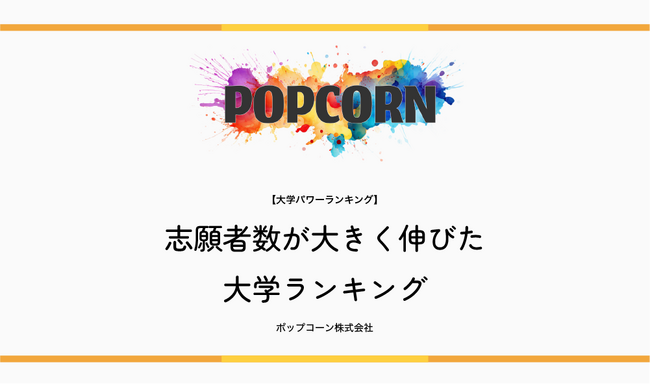 ポップコーン株式会社(本社:東京都渋谷区千駄ヶ谷5-21-5 601、代表取締役:大澤 陽平、URL:https://ppcn.co.jp/)は、2025年8月28日(木)、メディア「大学パワーランキング」にて『2025年度入試 志願者数大幅増加大学ランキング』を公開いたしました。