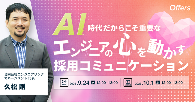 ハイクラスエンジニア採用プラットフォーム「Offers(オファーズ)」を運営する株式会社overflow(本社:東京都港区、代表取締役:鈴木裕斗、以下 overflow)は、「AI時代だからこそ重要な、エンジニアの「心を動かす」採用コミュニケーション ~採用成功率を上げる、理論と実践に基づいたコミュニケーション・スカウト戦略~」を2025年9月24日(水)にライブ配信、10月1日(水)にアーカイブ配信いたします。