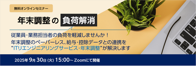株式会社ニーズウェル(本社:東京都千代田区、代表取締役社長 松岡元)は、2025年9月30日(火)15時より、無料オンラインセミナー「年末調整の負荷解消 ~従業員・業務担当者の負荷を軽減しませんか! 年末調整のペーパーレス、給与・控除データとの連携を「ITリエンジニアリングサービス・年末調整」が解決します~」を開催します。