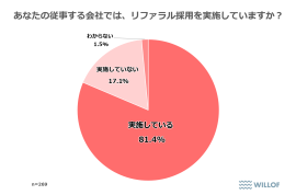 【リファラル採用という言葉を知っているか】について聞いたところ、「知っている( 64.7% )」と回答した人に対し(次ページ参照)、【あなたの従事する会社ではリファラル採用を実施しているか】について聞いたところ、81.4%が「リファラル採用を実施している」と回答しました。