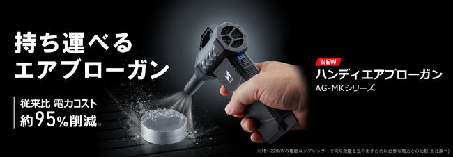 このたび発売する「ハンディエアブローガン AG-MKシリーズ」は、ワイヤレスでありながら圧縮空気に負けない超ハイパワー+高速応答を実現し、作業効率の大幅向上に貢献します。