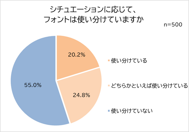 各ツールにおいてデフォルトのフォントから変えている人がいることがわかりましたが、プレゼン資料、謝罪文、催し事のお知らせなど、さまざまなシチュエーションに応じてフォントを使い分けているのかも調査しました。結果、「使い分けている(20.2%)」、「どちらかといえば使い分けている(24.8%)」を合わせて45.0%と、半数近くの人が状況に応じてフォントを使い分けている実態が明らかに。男女別では大きな差はありませんでしたが、年代別でみると、フォントを使い分けている人は20代で47.2%、30代で51.2%、40代で38.4%、50代で43.2%でした。比較的若年層の方が、フォントを使い分けている人が多い傾向にありました。