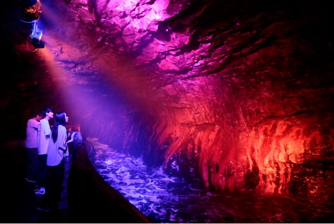 [画像2: https://prcdn.freetls.fastly.net/release_image/124453/7/124453-7-d40f7c0fcccba75edf78b784b282cb2e-1930x1086.jpg?width=536&quality=85%2C75&format=jpeg&auto=webp&fit=bounds&bg-color=fff ]三段壁洞窟では、500万個の星空を映し出す小型投影機「MEGASTAR CLASS」を使用し、プラネタリウム館と同様に180度の全方向に、煌めく500万個の美しい星空を創り出します。天の川が美しく映し出され、まるで洞窟に星が降っているかのような新感覚が味わえます。洞窟内の展望台では、ライトアップされた岩肌や波が夜の神秘的な雰囲気を演出。日中とは異なる洞窟探検をお楽しみいただけます。