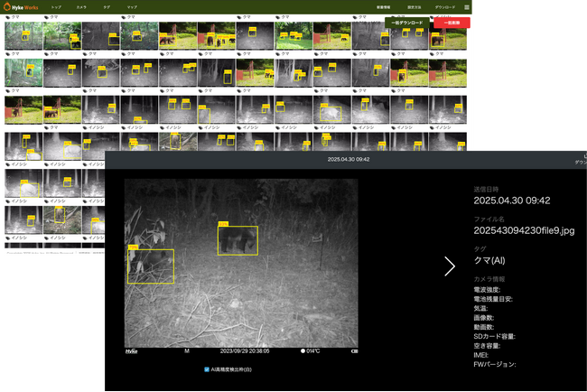 それが、IoTカメラとAI解析を組み合わせた先進的な仕組みです。株式会社ハイクの「ハイクカム LT+」は、動物を検知すると即座に撮影し、クラウドサービス「HykeWorks(ハイクワークス)」へ画像・動画を送信。