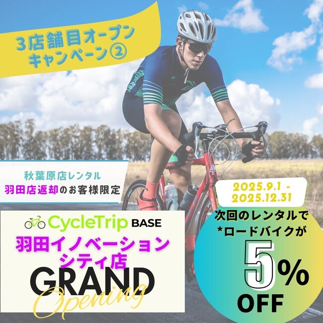日本最大級のスポーツ自転車専門レンタル店CycleTrip BASEが秋葉原店、名古屋店に続く第3店舗目となる羽田店(CycleTrip BASE Haneda)を東京都大田区にある複合施設、羽田イノベーションシティにて2025年9月8日グランドオープンします!
