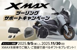 ヤマハ発動機販売株式会社は、2025年9月5日(金)から11月30日(日)の期間中、スポーツスクーター「XMAX」の新車をご購入・ご登録いただいた方全員に、「XMAX」と快適なツーリングライフを楽しんでいただくための最適アイテムを1点プレゼントする「XMAXツーリングサポートキャンペーン」を実施します。