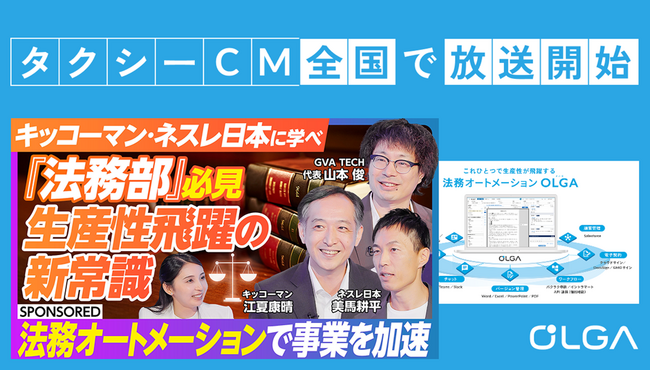 GVA TECH株式会社(本社:東京都渋谷区、代表取締役:山本 俊、以下GVA TECH)は、AIを活用して法務DXを実現する法務オートメーション「OLGA」初となるタクシー広告を、本日2025年9月8日(月)より全国放映いたします。