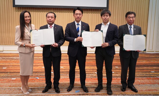 写真: 官民フォーラムにおけるMoU発表の様子。左からPANGroup ミーCEO、タン農業環境大臣、小泉農林水産大臣、AGRI SMILE 代表取締役 中道、三菱総合研究所 藪田代表取締役社長