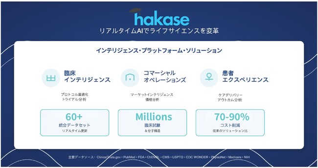 このプラットフォームの専用AIモデルは、ClinicalTrials.gov、PubMed、FDAデータベース、ChEMBLなどの情報源から取得した数百万件の臨床試験、分子構造、規制文書をもとに学習しています。このような包括的なデータ基盤により、予測分析、プロトコル最適化、創薬創出の加速、マーケットインテリジェンス、ケアデリバリーの改善が可能となります。さらに、高額な独自ソースではなく、無料で公開されているデータセットを活用することで、Hakase AIはコストを70~90%削減しつつ、より優れたインテリジェンスを提供。ライフサイエンス企業がバリューチェーン全体でデータ主導の意思決定を行えるよう支援します。