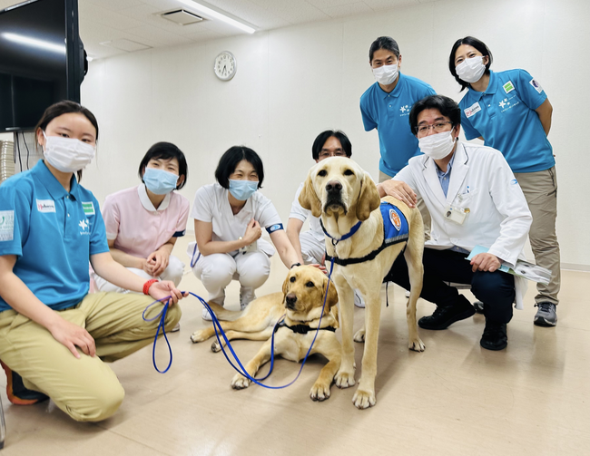 2024年5月、候補犬トミー、ミコの訪問時にファシリティドッグ導入ワーキング・グループの医療従事者の皆さんと。当日は入院患者の方々と触れ合い、活動の様子を実際にご覧いただきました。