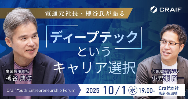 当日は、Craifの事業戦略統括であり、株式会社電通 元代表取締役社長の榑谷 典洋氏が登壇。メディア・コンテンツやデジタルマーケティングの最前線で新規事業と会社経営を牽引してきた同氏が、次なるキャリア機会としてディープテックに踏み出した背景を紹介し、20代で培った経験を30代で社会的インパクトへ転換するためのキャリア戦略について議論します。
